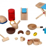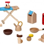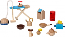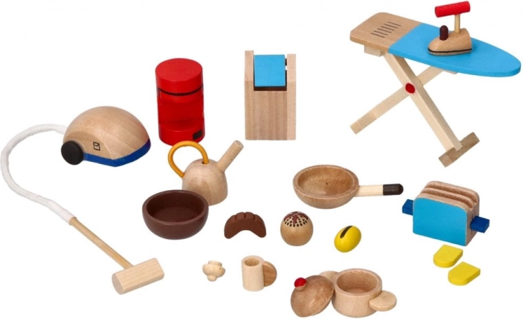 S touto nádhernou sadou 19 drevených hračiek si deti užijú hodiny zábavy v domácom prostredí. Set obsahuje rôzne domáce spotrebiče, ktoré napomáhajú detskému rozvoju a poznávaniu sveta okolo nás. Súčasťou balenia sú hračky ako kávovar, kanvica, vysávač, žehliaca doska a mnoho ďalšieho. Každý dielik je starostlivo spracovaný s ohľadom na bezpečnosť a estetiku.