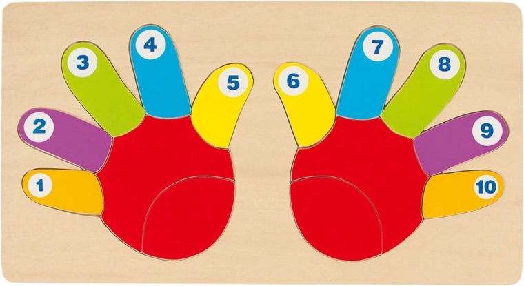 Drevené vkladacie puzzle Ruky od GOKI sú ideálnou voľbou pre prvé logické hry detí od 2 rokov. Ilustrácie ľudských rúk pomáhajú prirodzene sa učiť počítanie na prstoch a rozpoznávanie tvarov. Masívna drevená podložka zaisťuje stabilitu a ľahké skladanie.