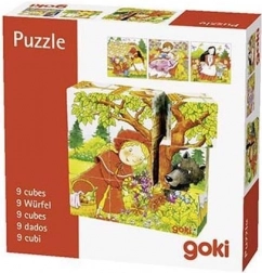 Tradičné drevené kocky s motívmi rozprávok od Goki ponúkajú 6 obrázkov poskladaných z 9 kociek. Deti pri skladaní rozvíjajú jemnú motoriku, obratnosť, koncentráciu aj predstavivosť. Súčasťou sú názorné obrázky pre jednoduchší začiatok. Vhodné od 3 rokov. Rozmer zloženého obrázka 10,5 × 10,5 × 3,5 cm. Materiál: drevo a papier.