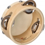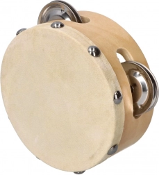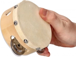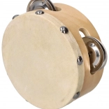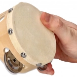 Tamburína má tradičný vzhľad s prírodným dreveným telom a pevne uchytenými kovovými činelmi.