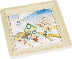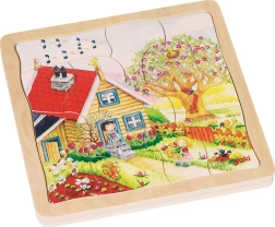 Toto vývojové drevené puzzle ponúka jedinečnú kombináciu zábavy a vzdelávania pre deti od 3 rokov. Každý zo štyroch obrázkov predstavuje jedno z ročných období a učí deti prírodovedné základy zábavnou formou.