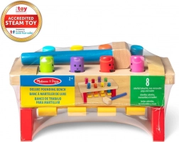 Táto drevená vbijanka ponúka nadčasovú hru: deti kladivkom jemne zatĺkajú pestré kolíky do lavice a z druhej strany ich opäť vytláčajú. Robustná drevená konštrukcia a hladké hrany zabezpečujú bezpečné hranie, zatiaľ čo výrazné farby podporujú rozvoj zrakového vnímania.