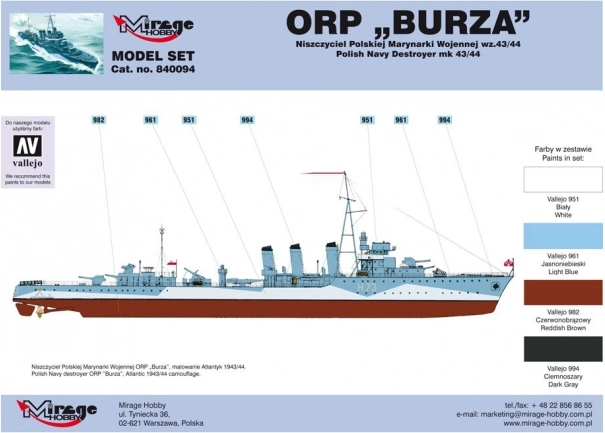Realistické prevedenie trupu, nástavieb, antén a veží zvýrazňuje charakter lode ORP Burza z obdobia 2. svetovej vojny.