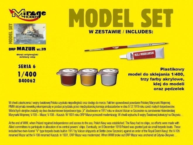 Postavte si ikonický poľský delový čln ORP Mazur (1939) v mierke 1:400. Kompletná stavebnica pre začiatočníkov aj pokročilých modelárov obsahuje plastový model, tri akrylové farby, lepidlo a štetec – ideálny štart do sveta lodného modelárstva.