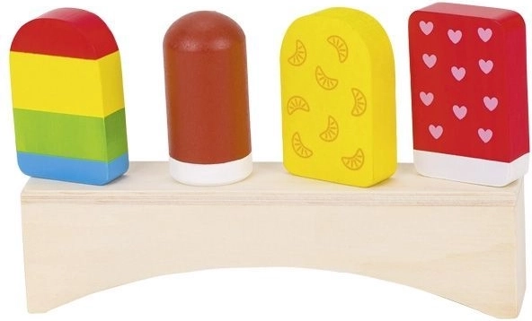 Sada obsahuje 4 rôzne drevené nanuky, každý s jedinečným dizajnom, aby si každý našiel svojho obľúbeného. Tieto hračky sú ideálne pre deti, ktoré radi hrajú rolu predavača alebo zákazníka. Drevená základňa ponúka skvelú príležitosť vystaviť nanuky na poličke alebo na hracom stole.