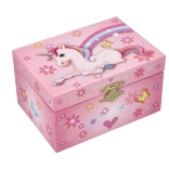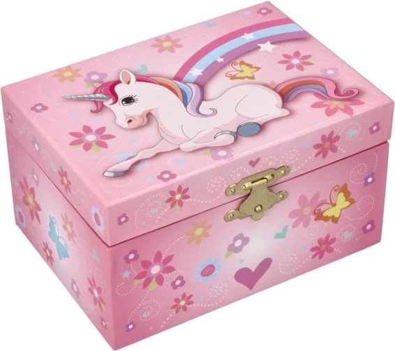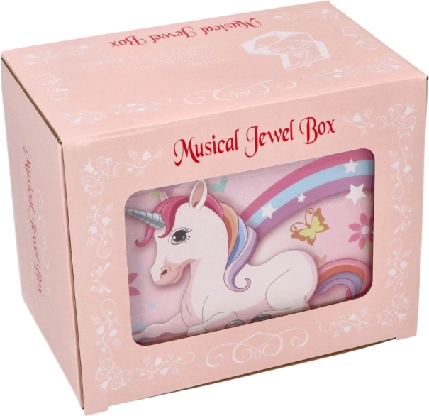 Šperkovnica v štýle hracej skrinky poteší každú malú dámu. Vo vnútri nájdete zrkadielko a roztomilú figúrku jednorožca, ktorá sa po otvorení veka začne otáčať na melódiu Labutie jazero. Vnútro je podšité hebkou látkou, aby boli retiazky, náramky či prstienky bezpečne uložené.