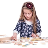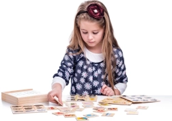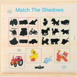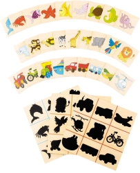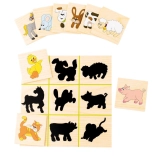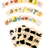 Farebné drevené doštičky s ilustráciami zvierat a vozidiel deti párujú s príslušnými tieňmi. Zábavná forma, ktorá podporuje rozlišovanie tvarov a trénuje pozornosť.