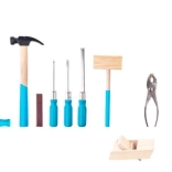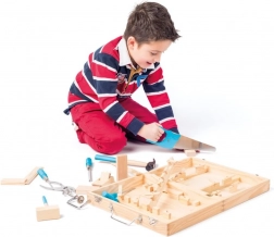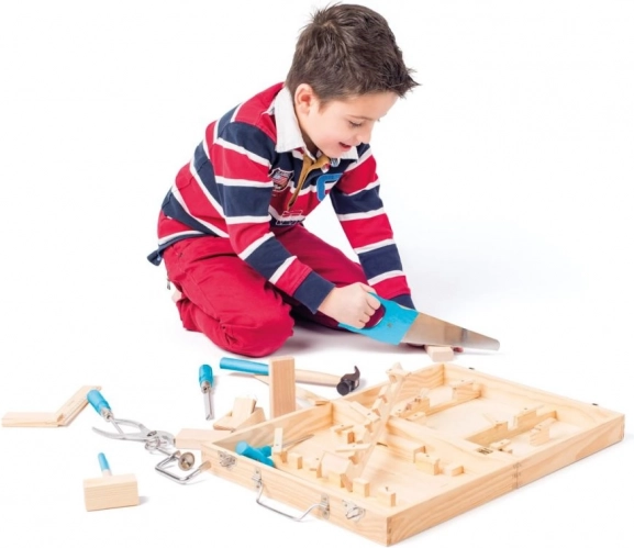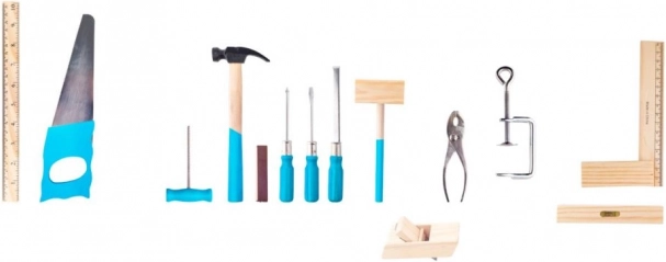 Súčasťou sú základné nástroje ako pílka, kladivo, skrutkovače, kľúč a pravítko v kombinácii dreva a kovu s pohodlnými modrými rukoväťami. Sada je navrhnutá na bezpečné a zmysluplné hranie a podporuje samostatnosť aj fantáziu.