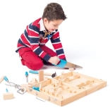 Táto drevená sada náradia v kufríku ponúka deťom realistickú skúsenosť s „opravami“ a tvorbou, a to bezpečne a zábavne. Vďaka pevnému kufríku s kovovými prackami majú všetky diely svoje miesto a sú vždy pripravené na hranie doma aj na cestách. Deti si pri hre trénujú zručnosť, koordináciu oko–ruka aj logické myslenie.