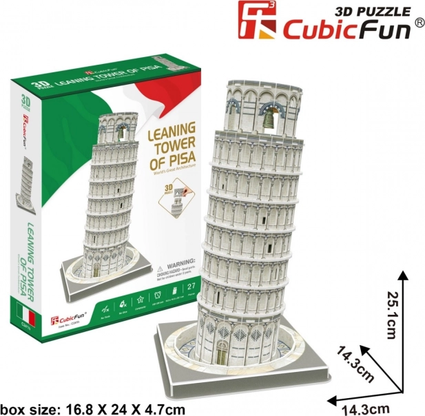 S touto sadou 3D puzzle je možné si vytvoriť vlastnú repliku svetoznámej Šikmej veže v Pise. Sada obsahuje 27 dielikov vyrobených zo špeciálneho materiálu, ktorý pripomína penu. Dieliky sú očíslované, predrezané na listoch a je ľahké ich vybrať a zložiť podľa priloženého návodu. Montáž nevyžaduje žiadne lepidlo ani špeciálne nástroje, čo znamená, že si tento projekt užijú aj začiatočníci. Po zložení bude mať stavba rozmery 14,3 x 14,3 x 25 cm.