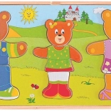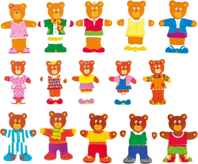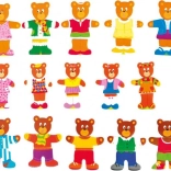 Obliekajte medvedíkov podľa nálady aj príležitosti a pritom sa učte kombinovať tvary aj farby. Deti ľahko menia hlavičky, telíčka a nožičky, trénujú postreh a vytvárajú veselé príbehy. Praktická drevená krabička udrží všetky dieliky pokope a jej veko slúži ako stabilná podložka na skladanie.
