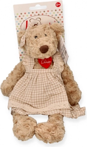 Plyšový medvedík Lumpinka v károvaných šatách. Hebká, bezpečná od 0+, ideálna na túlenie aj ako dekorácia. Ručné pranie 30 °C, cca 43 × 25 cm.
