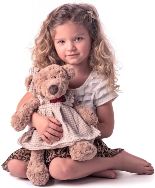 Zoznámte sa s medvedíkom Lumpinkou – jemným, maznivým a pripraveným robiť radosť od prvého dňa. Je oblečená do pôvabných károvaných šatočiek s čipkou a mašličkou, ktoré z nej robia štýlového spoločníka do postieľky aj na poličku.