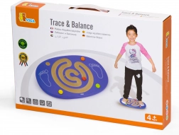 Balančná doska s labyrintom od VIGA premení tréning rovnováhy na zábavnú hru. Dieťa stojí na protišmykovej ploche s vyznačením chodidiel a nakláňaním dosky vedie farebné guličky vyfrézovanými dráhami. Táto interaktívna pomôcka rozvíja stabilitu, koordináciu oko–ruka a posilňuje hlboký stabilizačný systém.