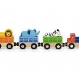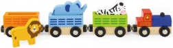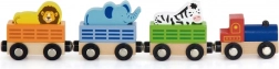 Drevený vláčik so zvieratami zo ZOO je ideálny doplnok k detským vlakovým setom aj samostatná hračka. Lokomotíva a tri pestrofarebné vagóniky s levíkom, slonom a zeberkou sa spájajú pomocou magnetov, takže sa s nimi ľahko manipuluje a deti môžu jednoducho skladať a rozpojovať súpravu podľa fantázie.