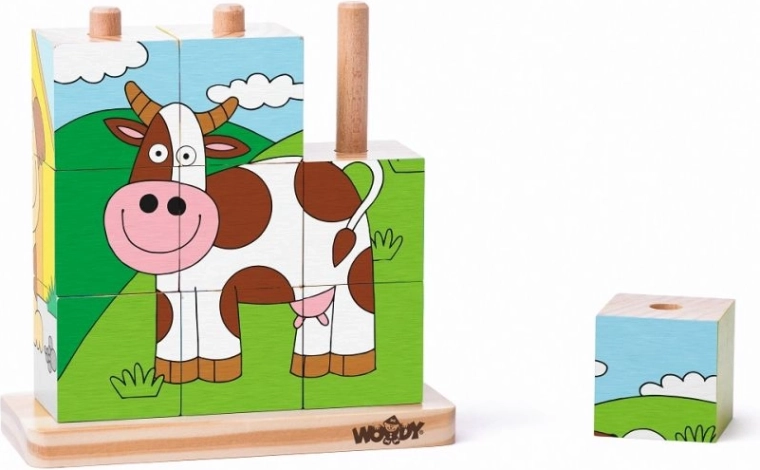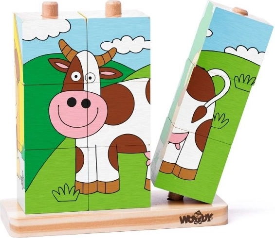 Puzzle obsahuje rozkošné ilustrácie zvierat ako krava, pes, ovca a mačka, ktoré vzbudzujú detskú zvedavosť a pomáhajú s rozpoznávaním.