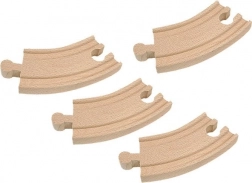 Táto sada 4 krátkych zakrivených koľají je skvelým doplnkom každej drevenej vláčkodráhy. Vďaka dĺžke 10 cm na diel ľahko vytvoríte kompaktné oblúky, prepojky aj nový tvar trate. Koľaje sa intuitívne napájajú a sú vhodné pre malých staviteľov od 3 rokov.