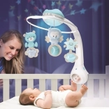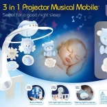 Tento všestranný kolotoč rastie s vaším dieťaťom: od novorodeneckého obdobia ako kolotoč s jemným svetlom a hudbou (0–5 mesiacov), cez nočnú lampičku s hudbou na postieľku (6–18 mesiacov), až po samostatnú lampičku s hudbou na nočný stolík (18+ mesiacov). Projektor premieta hviezdičky a vytvára pokojnú atmosféru pre ľahké zaspávanie.