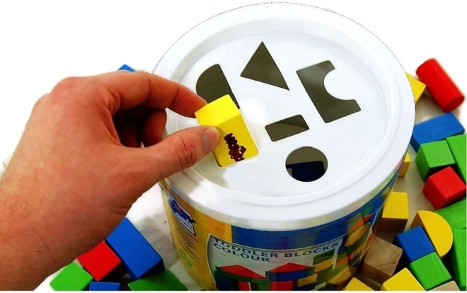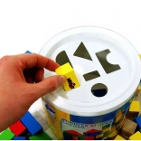 Vedierko s vekom obsahuje tvarové otvory, do ktorých deti vkladajú zodpovedajúce kocky, čo podporuje rozvoj rozpoznávacích schopností.