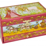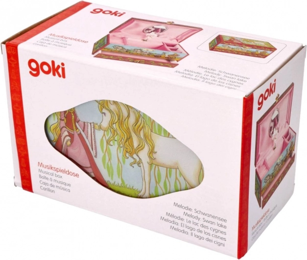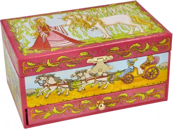 Šperkovnica v štýle hracej skrinky je ideálnym doplnkom pre malé dámy, ktoré chcú mať svoje šperky uložené s eleganciou. Po otvorení začne hrať melódia z opery Labutie jazero a biely koník sa roztočí pred zrkadlom.