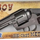 Klasický vzhľad kovbojského revolvera dopĺňa bezpečnostná farebná špička, ktorá jasne odlišuje hračku.