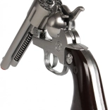 Štýlový kovbojský revolver v klasickom dizajne poteší malých pištoľníkov aj milovníkov westernovej atmosféry. Kovové telo dodáva hračke odolnosť a príjemnú hmotnosť v ruke, zatiaľ čo výrazná špička jasne ukazuje, že ide o bezpečnú hračku. Vďaka bubienku na 12 rán je hra plynulá a zábavná.