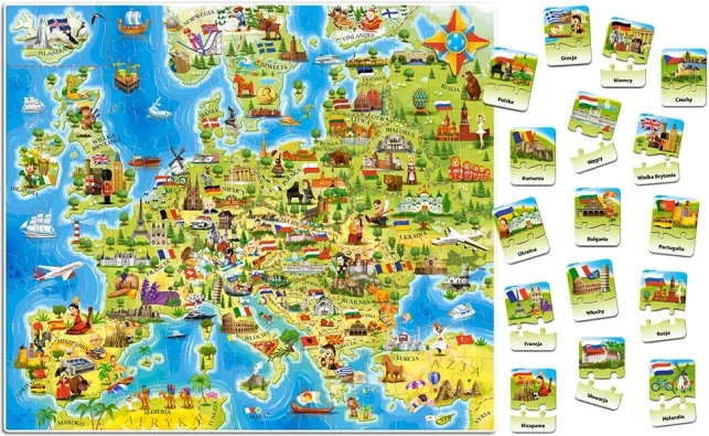 Edukacyjne puzzle Castorland Mapa Európy prepájajú zábavu s učením. Deti si poskladajú veľkú mapu kontinentu a zároveň vďaka kvízovým dielikom objavujú hlavné mestá, pamiatky aj typické symboly jednotlivých krajín. Na mape nájdete napríklad Karlov most v Česku, Koloseum v Taliansku, Vežu Eiffelovku vo Francúzsku, Brandenburskú bránu v Nemecku, Sagradu Família v Španielsku či Akropolu v Grécku.