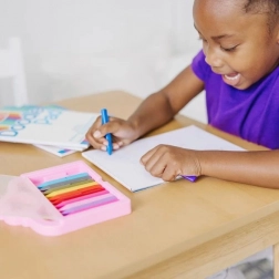 Všetky farby máte po ruke, voskovky sa nekotúľajú a deti môžu v pokoji tvoriť na stole alebo v detskom kútiku.