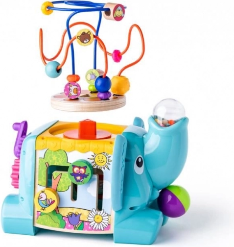Interaktívny slon v pestrých farbách je navrhnutý tak, aby deti motivoval k objavovaniu. Korálkový labyrint, otočné kolieska, posuvné prvky a prevody prinášajú množstvo spôsobov, ako trénovať prsty, úchop aj logické myslenie. Hračka je stabilná, ľahko sa drží a láka k opakovanej hre.