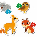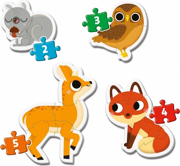 Objavte prvé skladanie s puzzle sadou CLEMENTONI pre deti od 2 rokov. Štyri samostatné skladačky s motívmi lesných zvieratiek (2, 3, 4 a 5 dielikov) majú veľké a pevné dieliky s hrúbkou cca 3 mm, ktoré sú ľahko uchopiteľné malými rúčkami. Hračka podporuje jemnú motoriku, koordináciu oko–ruka a priestorovú orientáciu pri zábavnom učení.