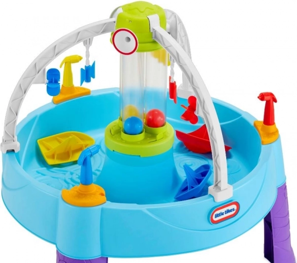 Stôl je vybavený rôznymi prvkami, ako sú otáčajúce ciele a vodný valec, ktoré podnecujú deti k dynamickej hre a rozvoju ich zručností.