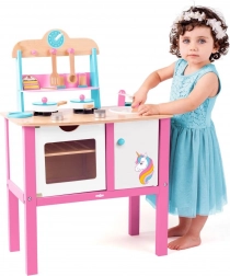 Objavte kúzelnú kuchynku WOODY s motívom jednorožca, ktorá premení detskú izbu na kreatívne kulinárske štúdio. Vďaka precíznemu spracovaniu z kvalitnej preglejky a dreva je stabilná, odolná a vizuálne atraktívna – skvelá voľba na každodennú hru na varenie.