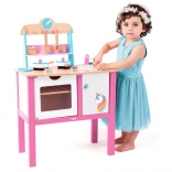 Realistické prvky ako otváracie dvierka, otočné ovládacie gombíky a ručičky na hodinách podporujú fantáziu aj jemnú motoriku. Výška pracovnej plochy 50 cm je ideálna pre malých kuchárov a kuchárky, zatiaľ čo jednoduchá montáž podľa priloženého plánu poteší rodičov.