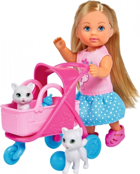 Bábika Evička prináša fantastický svet imaginácie deťom s dvoma roztomilými mačičkami a kočíkom, ktorý disponuje odnímateľným košíkom a rôznymi doplnkami, ktoré podnecujú kreatívnu hru.