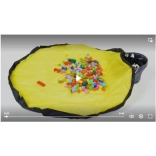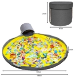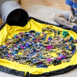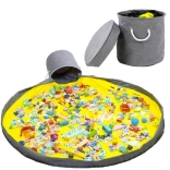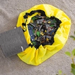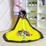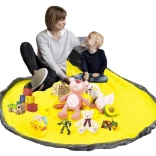 Rozložte veľkú podložku (Ø 135 cm), nechajte deti hrať sa a po skončení potiahnite za šnúrku so stopperom – hračky sa v okamihu schovajú do koša.