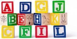 Abecedné kocky s písmenami a jednoduchými motívmi motivujú deti k prvým slovám a hravému spoznávaniu abecedy.
