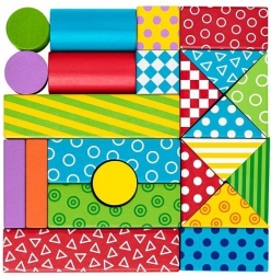 Sada 35 drevených kociek rôznych tvarov, farieb a vzorov podporuje fantáziu, jemnú motoriku a rozpoznávanie tvarov a farieb.
