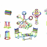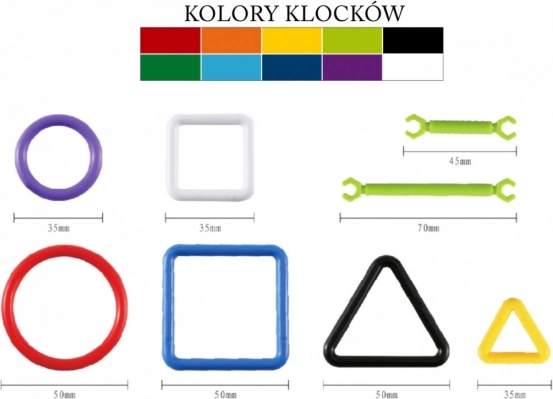 Pestrosť prvkov v 10 farbách umožňuje vytvárať fantastické postavičky, ako je bicykel, auto, ležadlo alebo dáždnik.