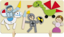 Magnetická tabuľka a stojančeky udržia všetky dieliky na mieste. Deti si ľahko vytvoria vlastné stredoveké výjavy, ktoré môžu kedykoľvek obmieňať.