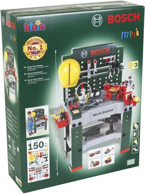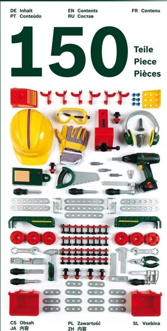 Kompletný detský pracovný ponk BOSCH so 150 dielmi prináša realistické náradie a príslušenstvo pre malých majstrov. Obsahuje akumulátorový skrutkovač, pílu, kladivo, kľúče, kliešte, skrutky a matice aj pevný stojan s dierovanou stenou na prehľadné uloženie. Kvalitný plast zaisťuje odolnosť a hra podporuje kreativitu a jemnú motoriku na dlhé hodiny zábavy.