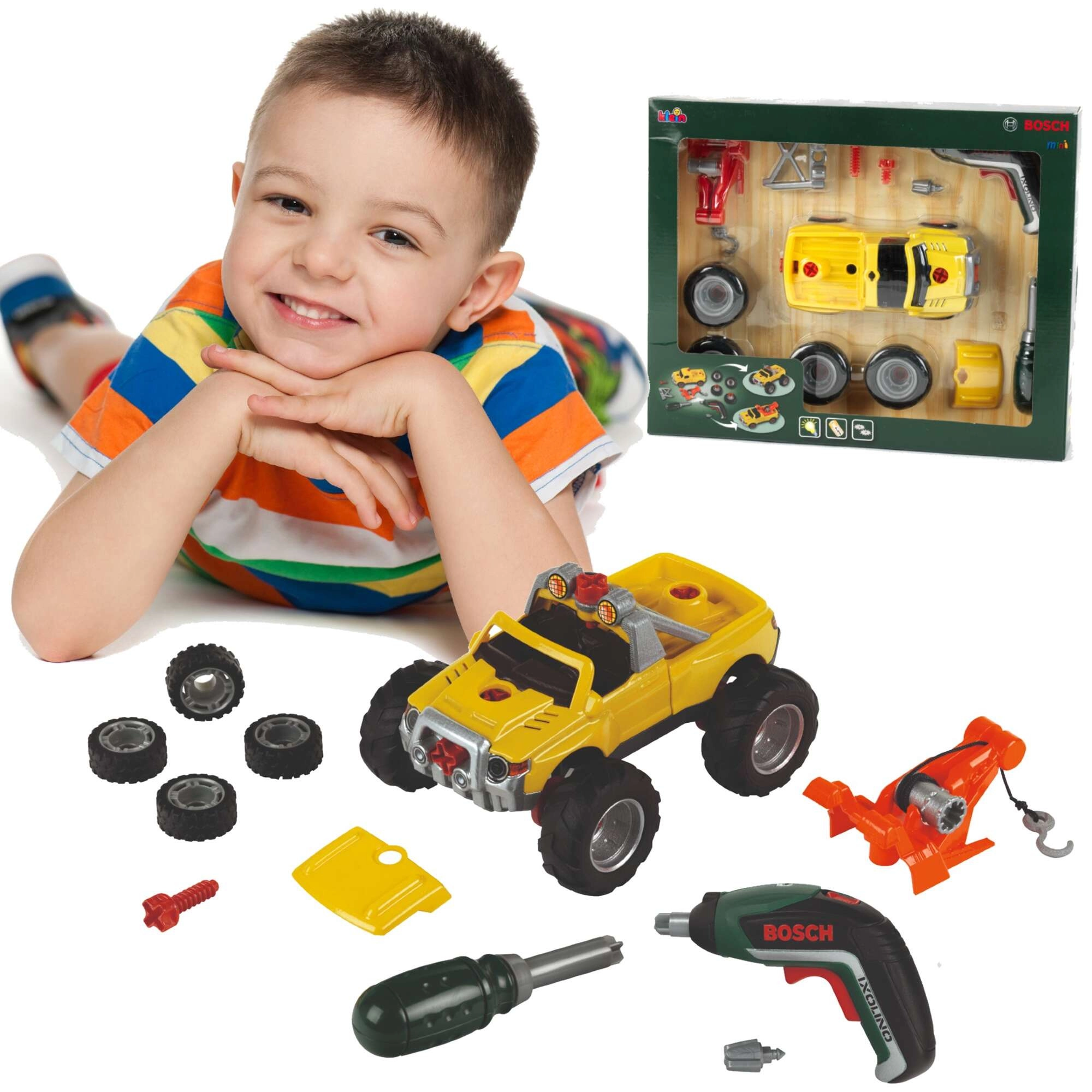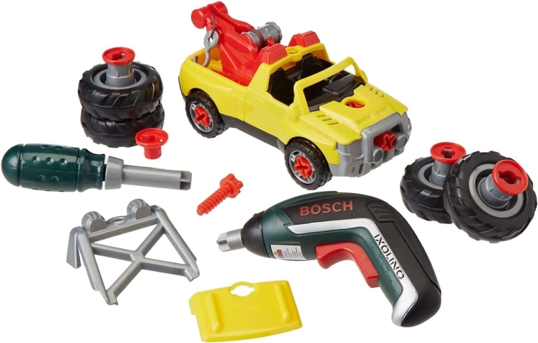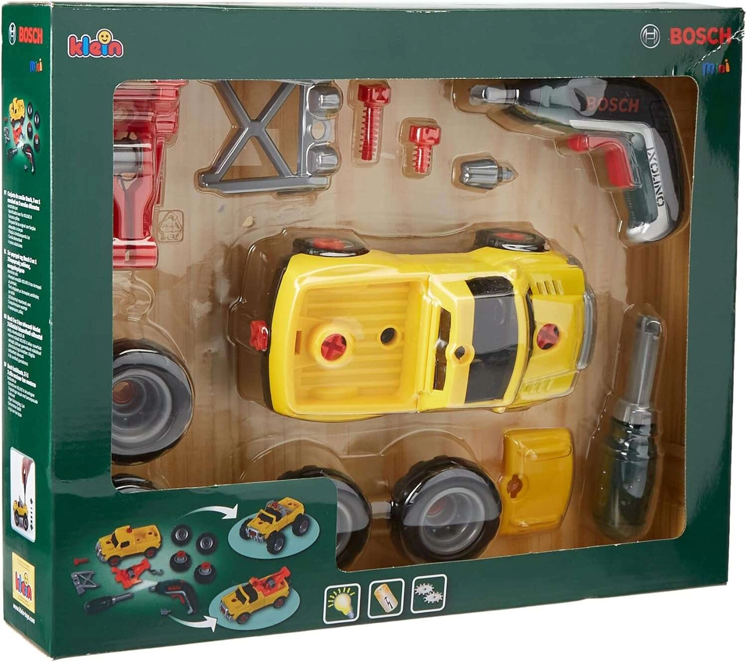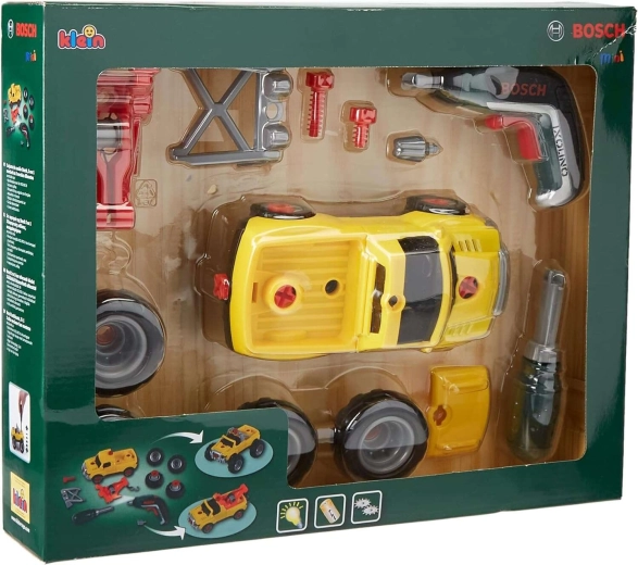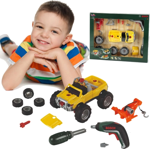 Súčasťou je žlté auto na skrutkovanie 3v1, aku skrutkovač Bosch Ixolino II s obojsmerným chodom a zvukovým efektom, ručný skrutkovač, výmenné bity, terénne kolesá, červený odťahový hák, maska a rám s reflektormi. Deti môžu vozidlo prestavať do troch variantov a zábava sa tak len tak neskončí.