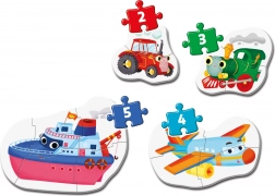 Objavte zábavný svet skladania pre najmenších. Tento set obsahuje štyri samostatné puzzle s motívmi rôznych dopravných prostriedkov a stupňovanou náročnosťou (2, 3, 4 a 5 dielikov), aby si deti mohli postupne budovať istotu aj zručnosti.