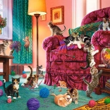 Puzzle zobrazujú útulnú obývačku plnú hravých mačiatok a farebných klbiek vlny.