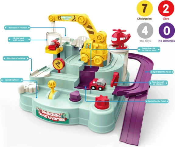 Táto prekážková dráha premení každú jazdu na malé dobrodružstvo. Na trase čaká množstvo prekážok, ktoré deti zvládnu vďaka šikovnému ovládaniu pomocou koliesok a páčok. Každý úspech motivuje k ďalším pokusom a prináša veľa radosti aj zdravej súťaživosti.