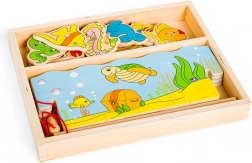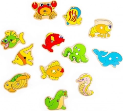 - 12 morských tvorov, 2 magnetické prúty, pevná drevená krabička (konštrukcia nádrže)