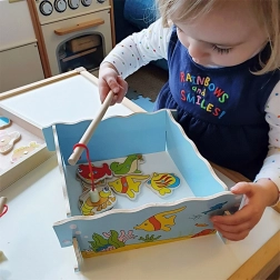 Chytanie rybičiek na magnet podporuje jemnú motoriku, koordináciu oko–ruka a sústredenie – navyše zábavnou formou, ktorá deti len tak neprestane baviť.
