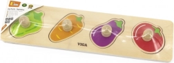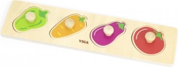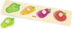 Táto kvalitná drevená skladačka so zeleninovými tvarmi (paprika, mrkva, baklažán, paradajka) je ideálna prvá puzzle pre deti od 1 roka. Veľké dieliky s úchopovými gombíkmi podporujú správny úchop, trénujú koordináciu oko–ruka a pomáhajú deťom rozlišovať farby a tvary.