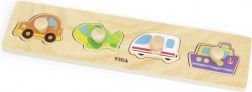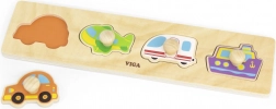Veselé farby a zreteľné obrysy pomáhajú rozvíjať zrakové vnímanie a slovnú zásobu – dieťa spoznáva auto, loď, lietadlo či karavan a učí sa ich pomenovať. Kvalitné drevené spracovanie zabezpečuje dlhú životnosť a bezpečné hranie.