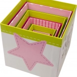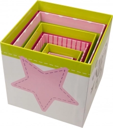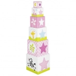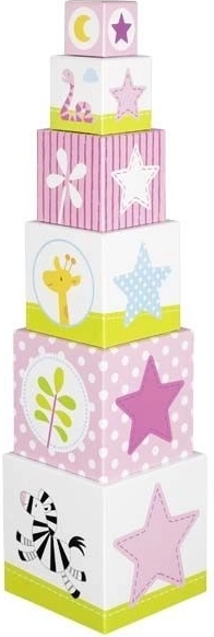 Sada obsahuje 6 pevných kartónových kociek, ktoré možno stavať do vysokej veže alebo vkladať do seba. Každá kocka je zdobená priateľskými ilustráciami zvierat, rastlín a číslic, vďaka čomu deti zábavnou formou rozvíjajú základné zručnosti a trpezlivosť.