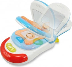 Usmiaty telefón je aktívna hračka, ktorá deti zaujme na dlhý čas. Vďaka pohyblivej klapke, veselým melódiám a blikajúcim svetielkam rozvíja sluch, zrak aj jemnú motoriku. Po otvorení klapky sa objaví bezpečné zrkadielko na zábavné grimasovanie a objavovanie vlastného odrazu.